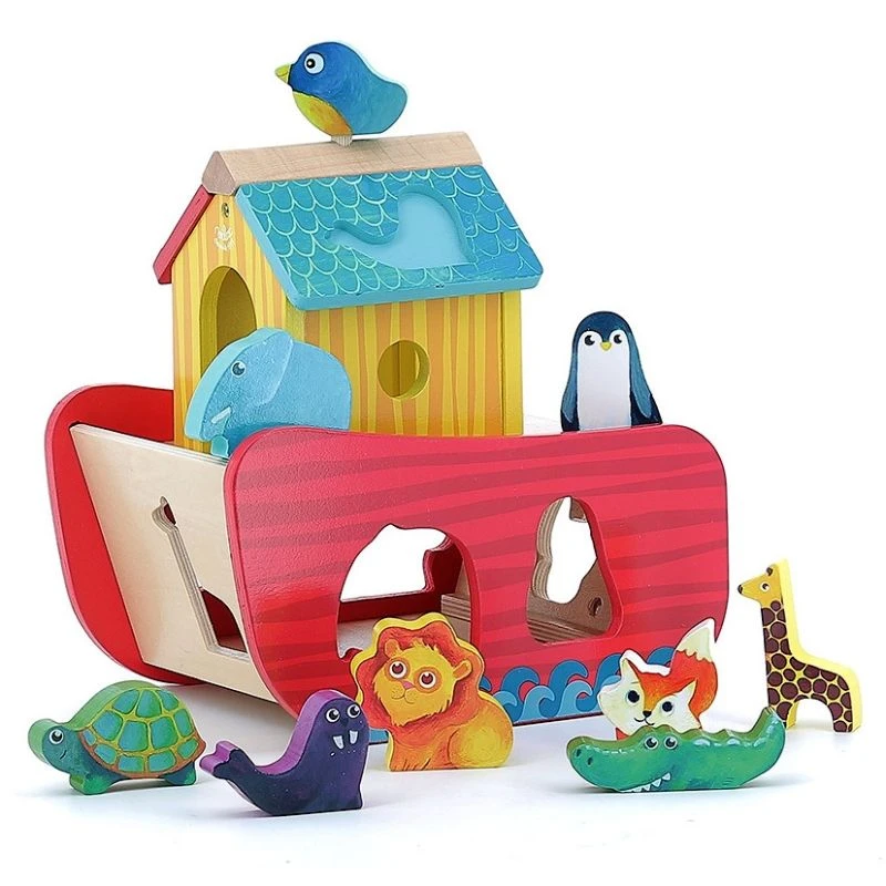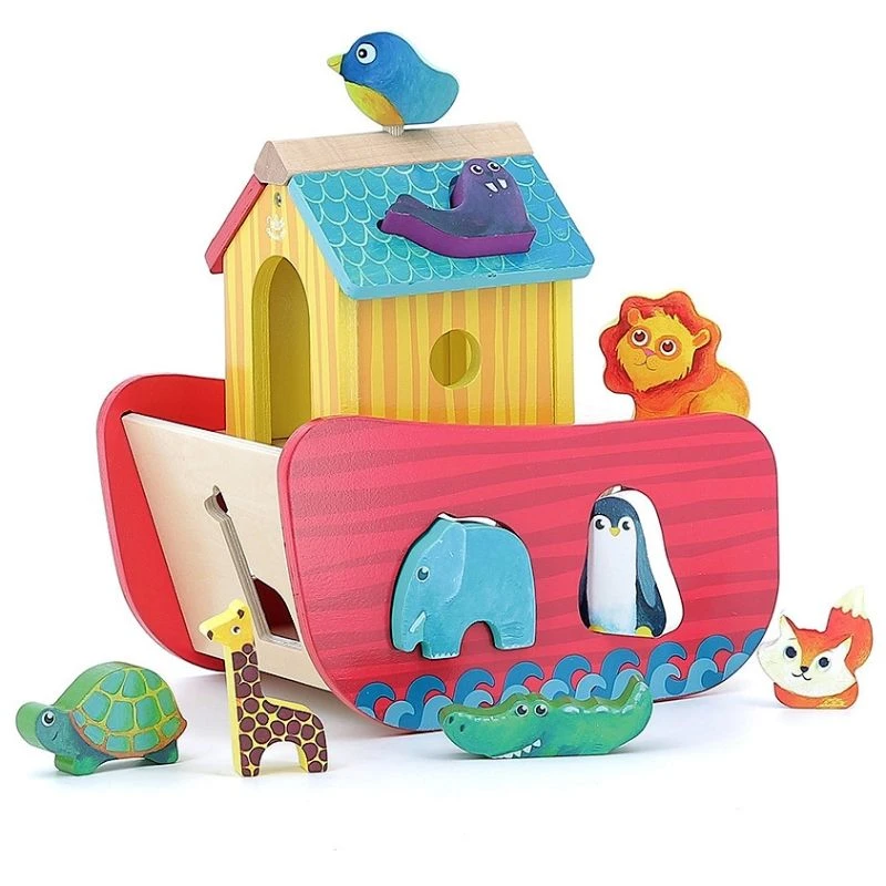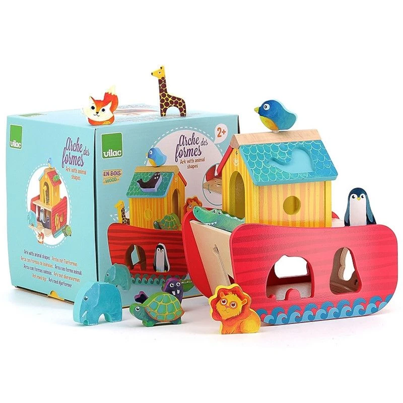 Pour les petits aventuriers dés 2 ans, éveil physique et émotionnel avec cette adorable petite Arche des Animaux boite à forme pour parler du déluge… Jouet en Bois Boite à formes Arche de Noé des Animaux Vilac® tendrement colorée. S’il fallait sauver neuf petits animaux formidable ce serait ceux ci: La girafe, l’éléphant, l’oiseau, le pingouin, la tortue supposons terrestre, le morse, le lion, le renard, le crocodile et la girafe. Et oui sur cette jolie Arche de Noé en bois, il n’y a pas de place pour tous les animaux, mais ceux là seront choyé. L’arche est magnifique, mignonne et pratique. Une boite à forme ou chacun des 9 animaux trouvent leur silhouette pour entrer. Un joli jouet classic et adorable dont les couleurs vive plairont surement à votre enfant.