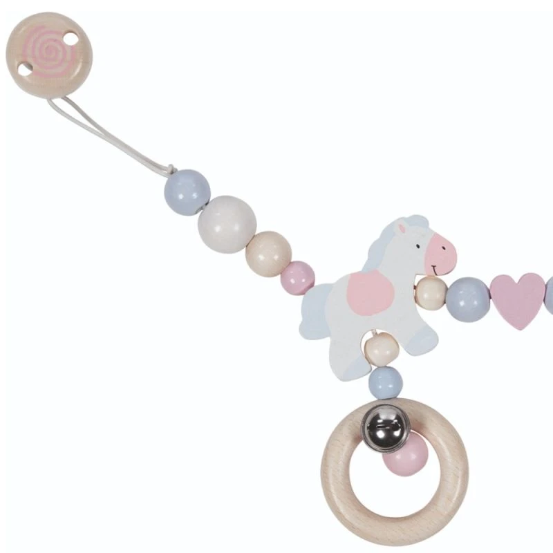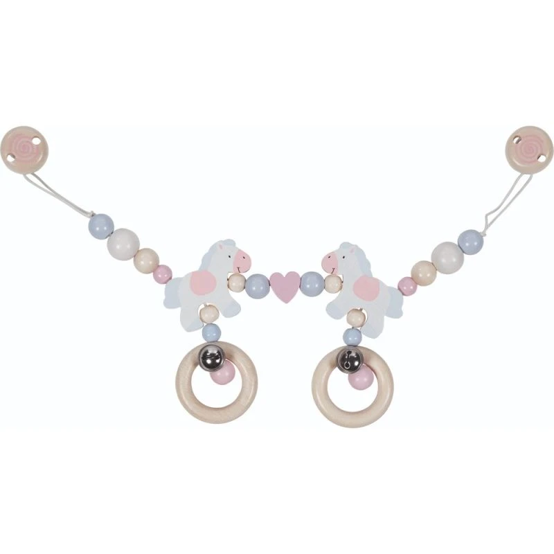 Pour les touts petits voyageurs, cette magnifique chaîne de Poussette à clipser en bois Goki avec de jolies perles, des anneaux à grelots et des petits poney aux tendres couleurs pastelles roses et bleues est magnifiquement réalisée. La plus tendre et naturelle des Chaînes de poussette en bois avec clips Poney Goki® est une succession d’anneau, de grelot, de perles rondes, de petits poney roses et bleus rendent cette chaîne de poussette attrayante et ludique. La plus belle, simple et naturelle des chaines de poussette… Et bien sur les clips magiques, permettent de l’accrocher au berceau ou à la poussette..