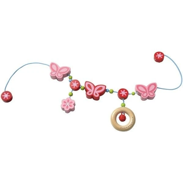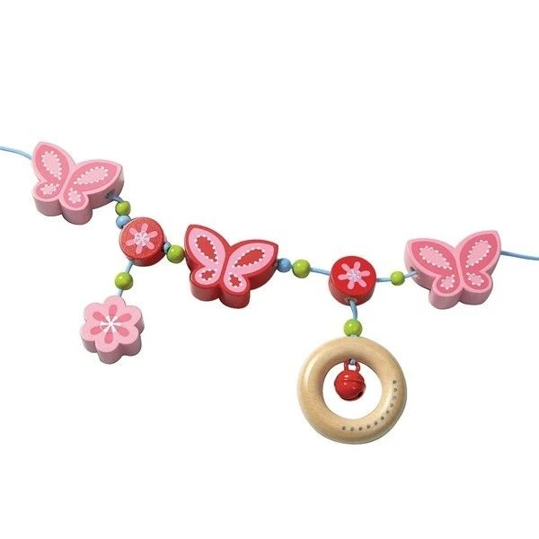Pour les bébés dès la naissance, et pour apporter gaitée et bonne humeur en ballades, cette jolie Chaîne de Poussette HABA® Papillon féerique en bois de hêtre est idéale. Une chaine d’activité en bois assortie à son hochet, et son attache tétine, et ou de petits papillons roses se promènent sur un fil entre les deux pinces qui permettent de l’attacher à la poussette, au bord du parc ou ailleurs…. Une petite chaine d’activité ou de poussette en bois naturel, peint avec finesse et attention. Un accéssoire pour bébé, écologique, sains et beau pour accompagner bébé dans ses premiers instants de d’éveil.