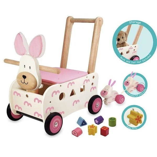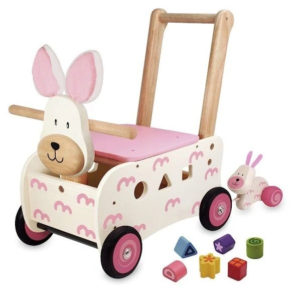 Pour les petits promeneurs dés 12 mois éveil physique et émotionnel avec ce superbe Chariot de marche en bois 3 en 1 Lapine Rosa Blanche I’m Toy®, à la fois Chariot de marche, porteur et boîte à formes en bois d’hévéa issu de forêts gérées durablement… Bébé peut consolider son apprentissage de la marche tout en promenant le petit lapin à tirer. qui suit sa maman, permettant de distraire nos petits aventuriers et les encourager à continuer leur efforts