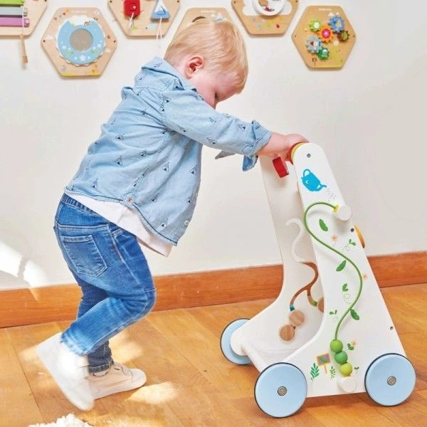 Un merveilleux premier trotteur en bois, un outil de développement parfait pour les tout-petits en pleine croissance. Un randonneur multifonctionnel magnifiquement équilibré et décoré sur le thème de la nature avec des motifs de jardin, de bois et d’arc-en-ciel. L’avant comporte 10 activités de jeu différentes et les côtés une activité de jeu pour maximiser la valeur de jeu. Une élingue en tissu pratique offre une valeur de jeu supplémentaire. Un jouet durable en bois de caoutchouc et fini avec des couleurs à base d’eau. À partir de 12 mois. Collection Petilou de Le Toy Van..