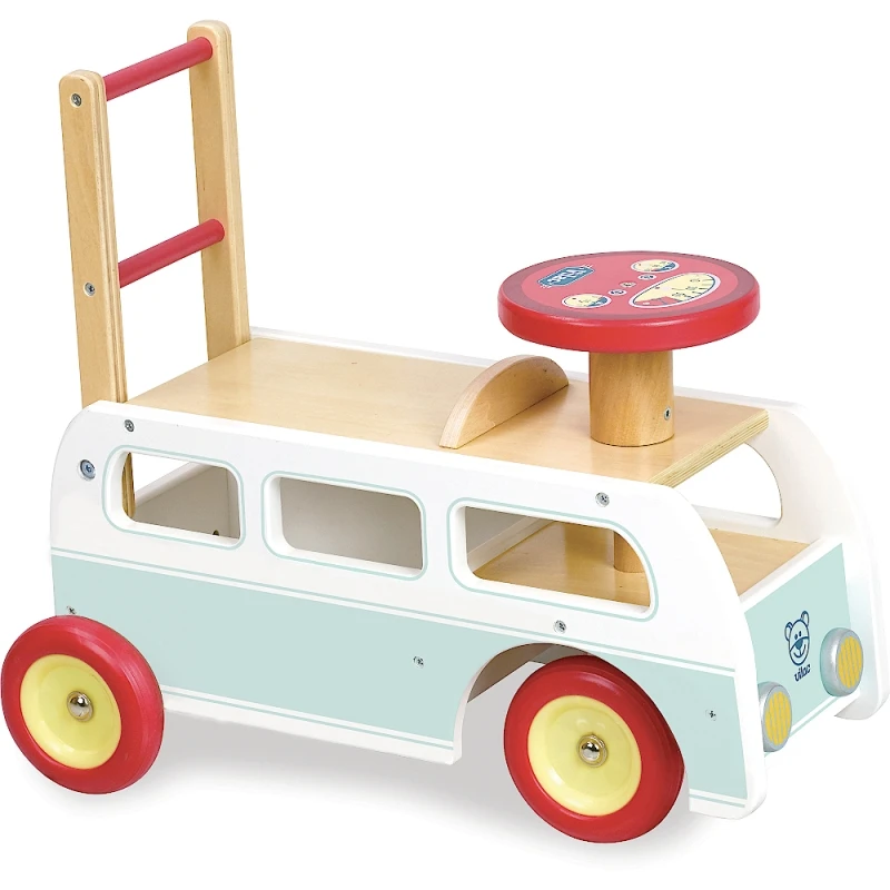 Pour les petits promeneurs dés 12 mois éveil physique et émotionnel avec ce fabuleux engin 2 en 1, à la fois Chariot de marche et Porteur en bois… issu de forêts gérées durablement: Chariot de Marche Porteur Combi WW Retro 2 en 1 en bois Vilac®. Que rêver de mieux « Le paradis, partir, déserter cette société de consommation infernale… j’ai besoin de rien, mon doudou, ma tutu et mon Combi, …Ciao!!! » Mais en plus du look un peu old school ou surfeur de ce petit véhicule, c’est bien de marcher et développer quelques équilibres dont il s’agit, avec ses 4 roues en caoutchouc pour tenir sur les parquets, son volant côté conducteur, et son guidon pour le pousser, ce petit chariot de marche & porteur 2 en 1 en bois Vilac® sera de toutes les aventures. D’un bleu ciel azur, ce petit « Combi » est une invitation au voyage, à la découverte et à l’indépendance. Avec ses phares sympas, ses pneus rouges et sa forme légendaire Vilac® n’a pas raté sa cible…