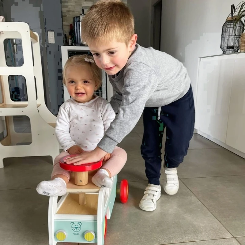 Porteur et pousseur en forme de combi rétro ! Un deux-en-un pour ce chariot à pousser en bois qui devient un porteur au fil du développement de l’enfant. Muni d’un klaxon sur le volant pour avertir de son arrivée et faire monter doudou à l’intérieur. En plein cœur du Jura, entre montagnes, lacs et forêts, entre Champagnole et Saint-Claude, Vilac crée depuis plus de cent ans, des jouets en bois à Moirans-en-Montagne. Des jouets indémodables, des jouets uniques qui font rêver toutes les générations