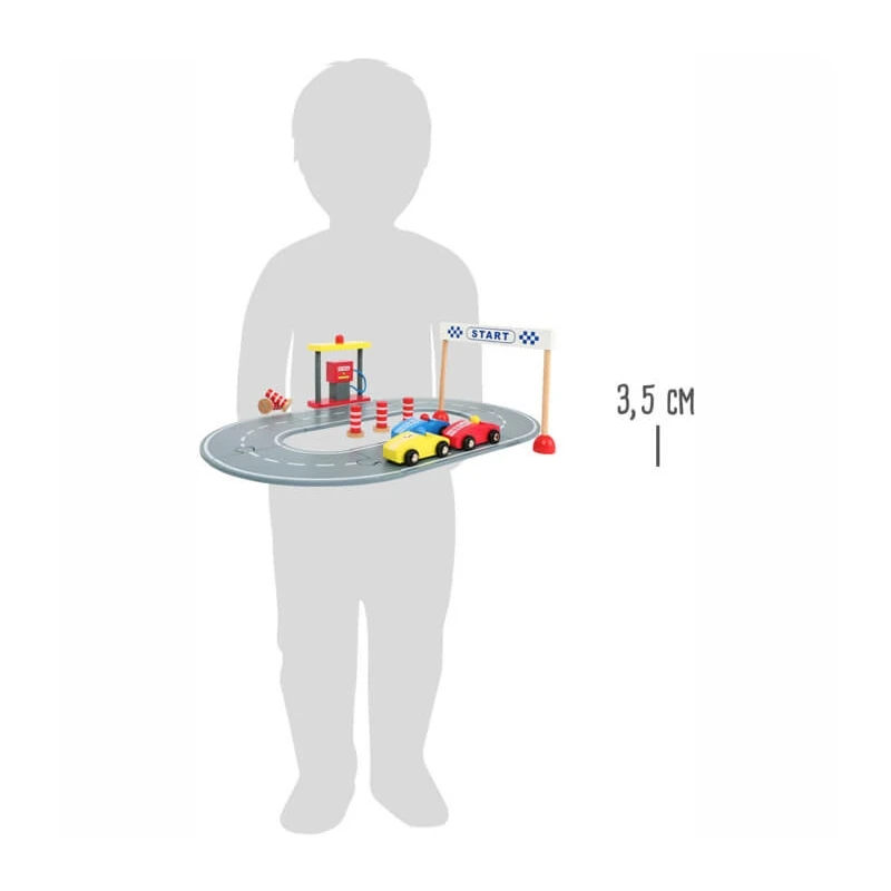 Pour les petits à partir de 36 mois, éveil physique et imagination avec cet amusant Circuit Course automobile avec kit petites voitures Small foot by Legler® Un circuit en bois et tous les accessoires pour assurer la course: pompe à essence, balises et banderole d’arrivée et trois petites voitures en bois. Les trois voitures sont adaptés aux petites mains pour assurer le développement de la motricité fine.