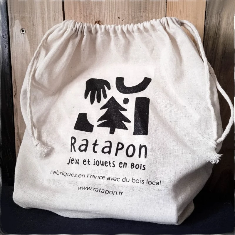 Emballage Zéro déchet: Chaque jouets en bois Ratapon® est proposé sans emballages ou dans une pochette textile de coton lorsque le jouet est composé de plusieurs pièces.