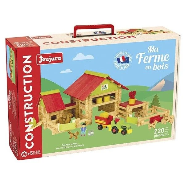 Pour les petits aventuriers dés 5 ans, amoureux des alpages, de la vie à la ferme… éveil physique et émotionnel avec cette jolie ferme en bois ‘Grande Ferme avec Tracteur & Animaux Chalet à Comté Jeujura® 220 pièces. Une ‘fruitière à Comté’ son tracteur, ses animaux, le fermier et la fermière, l’étable, la grange, le poulailler, etc…. Une ferme éducative, illustrant la vie à la ferme et la filière du Comté. Un jouet simple, beau et pédagogique pour s’amuser au petit fermier, tout en se sensibilisant aux valeurs de l’agriculture Jurassienne. Un jouet intemporel fabriqué pour durer, qui rappellera certainement quelques souvenirs aux parents qui ont eu la chance de jouer avec étant petit…. 200 pièces en bois naturel teinté, les petits madriers originaux de chez Jeujura® qui éveillent les sens et l’imaginaire des petits depuis 100 ans.