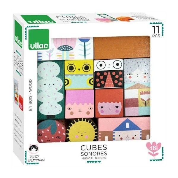 ✎ Les Hochets en bois sensoriel Cubes sonores Suzy Ultman Vilac® détails