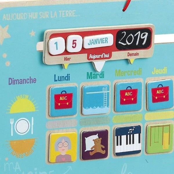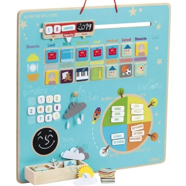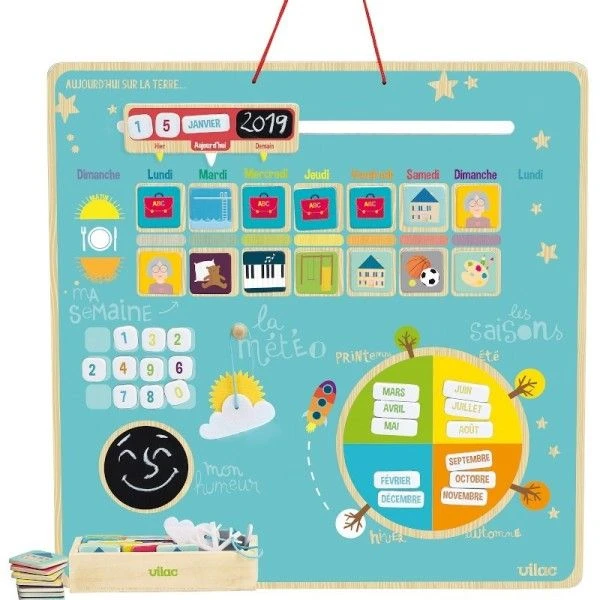 Pour les petits écoliers, dès 3 ans mais sans doute pour les petits de 5 ans et pour se familiariser avec le temps qui passe, les saisons, les mois, les jours de la semaine et les activité.. et le jours même avec la date, la météo et même l’humeur du jour…, ce magnifique semainier à suspendre, Jouet en Bois d’Eveil Semainier Magnétique ‘Aujourd’hui sur la terre’ Vilac® sera idéal pour familiariser les petits écoliers à la notion du temps…