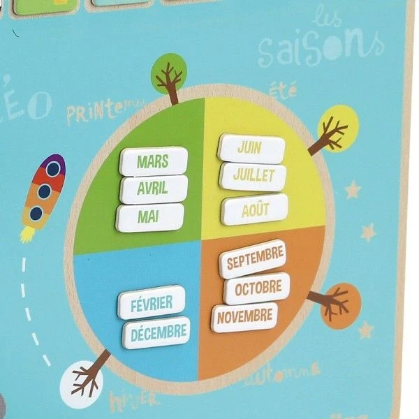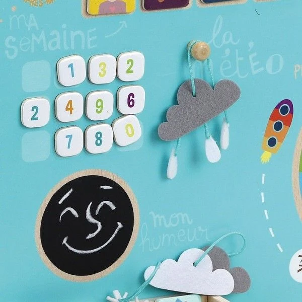 Petite routine matinale, comme à l’école et à l’aide des magnets, l’enfant peut changer le jour, le mois, l’année, l’activité du matin et de l’après-midi (école, sieste, jeux…). Sont également fournis des éléments à accrocher pour indiquer la météo du jour: soleil, nuage, pluie, neige… Ce calendrier en bois permet aussi l’apprentissage des saisons grâce à l’illustration et aide votre enfant à se situer dans l’année. Votre bambin peut aussi dessiner son humeur du jour à la craie… Tous les accessoires se rangent facilement dans la petite case prévue à cet effet.