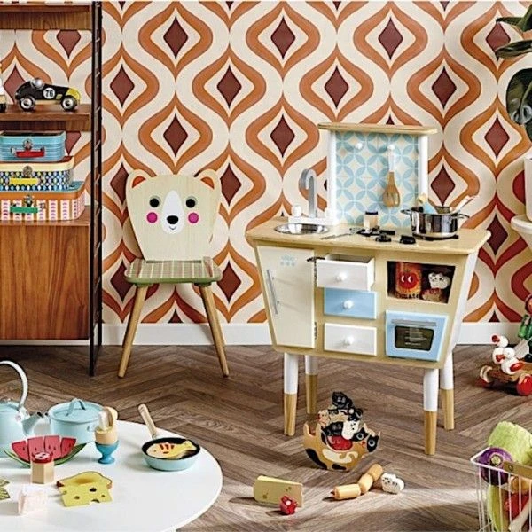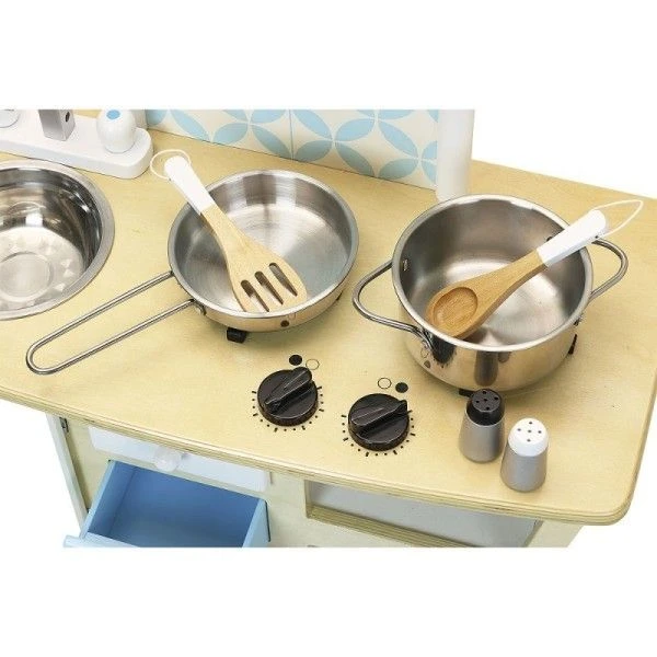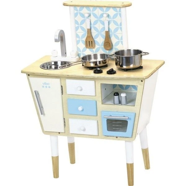 Pour les petits cuisiniers gourmands et écolos dés 36 mois, éveil émotionnel et imagination avec cette superbe petite cuisine dînette cuisinière avec four, Jouet en bois Dinette Cuisine Vintage Art Déco Vilac® et son look très vintage en bois massif, et ses ustensiles (1 marmite et 1 poêle en métal, 1 salière, 1 poivrière et 2 ustensiles de cuisine) … Un look année 60, avec sa crédence en carreau de ciment, sa forme original et ses pieds bi-colore. Côté équipement, tout y est de l’évier au plaque, en passant par les nombres rangements et le four.