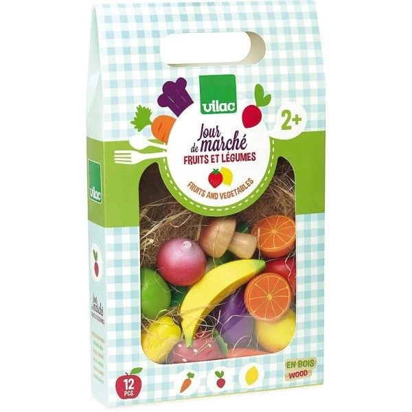 Les Jouets en bois Set de Fruits & Légumes ‘Jour de Marché’ Marchand(e) Vilac® se composent et sont: