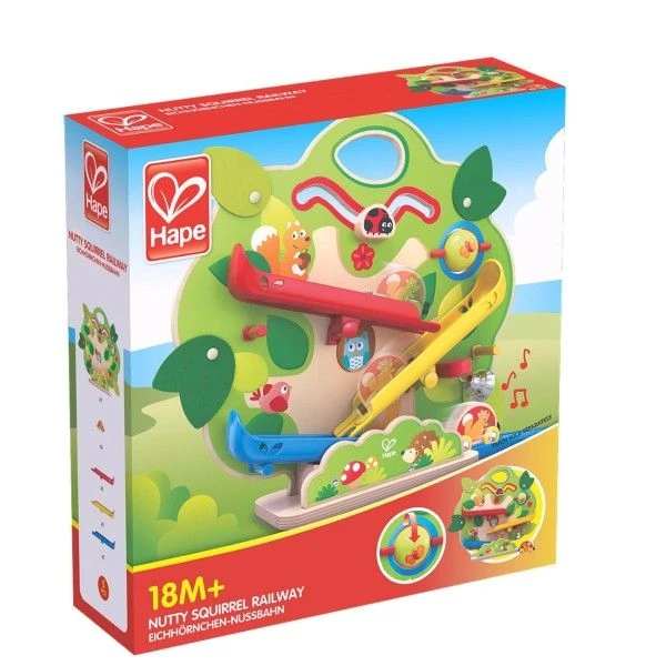 ✎ Les Jouets en bois Toboggan Circuit Train ‘Chemin de Fer Écureuil’ Hape® se composent et sont: