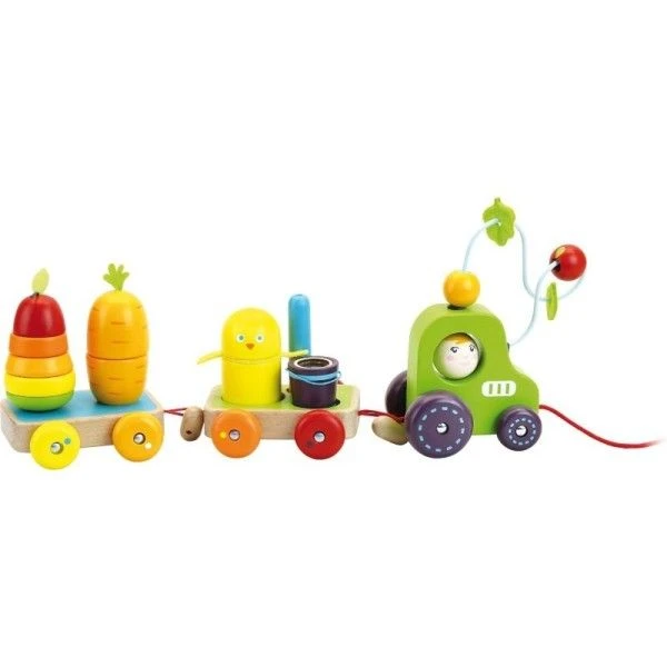 Un empilable poire qui cache un ver, un petit lapin caché dans une carotte, un oiseau et un canard qui font du bruit, un seau de maïs maracas et un tracteur Monsieur / Madame sur lequel il faut faire coulisser des fruits. Tout un univers imaginaire pour développer la motricité et la curiosité des petits !
