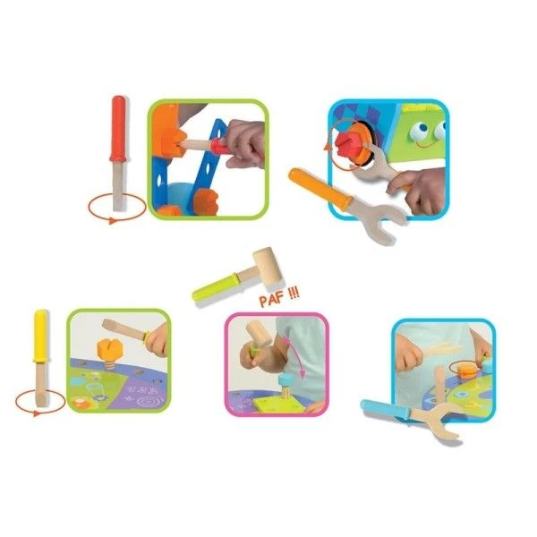 Les jouets de bricolage comme ce Jouet Etabli de Constructions en bois 56 Pièces Bricolo Boikido® sont recommandés pour le développement de l’enfant et favorisent les jeux de rôles, la construction de soi et la compréhension de l’environnement. En imitant, l’enfant interagit avec son environnement, il construit ainsi ses structures cognitives. En manipulant de nombreux petits objets, comme dans ce jeu de bricolage, il développe sa motricité fine. Lorsque l’enfant assemble des pièces, utilise ses outils comme son papy, il ajuste ses gestes pour parvenir à son but. Enfin, l’imitation joue un rôle majeur dans la socialisation. Le fait de jouer d’autres rôles permet de prendre conscience de l’existence de l’autre mais aussi de soi-même et de jouer en interaction.