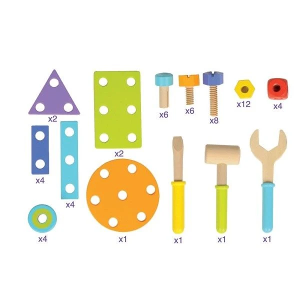 ✎ Les Jouets Etabli de Constructions en bois 56 Pièces Bricolo Boikido® détails