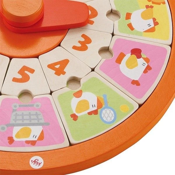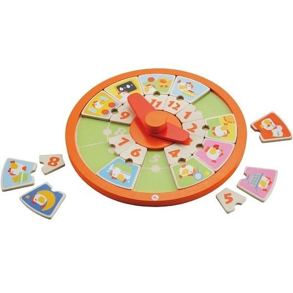 Très coloré, cette horloge en bois et ses 24 pièces (12 chiffres = heures de la journée + 12 activités de Coccodé) deviendra vite un jouet incontournable et apprécié.