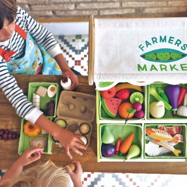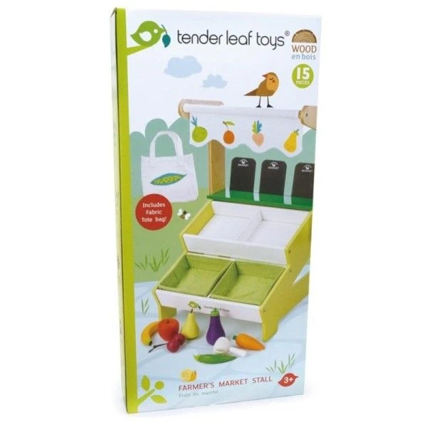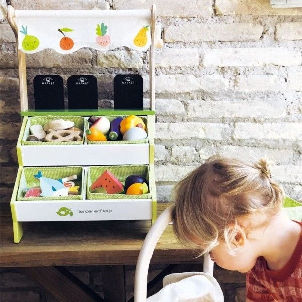 Pour les amoureux du commerce et des produits bio dés 36 mois, éveil émotionnel et imagination avec ce joli étal de marché et ses fruits et légumes… Jouet Marchande en bois Étal de marché Tender Leaf Toys® … Un joli présentoir de marché pour y étaler ses produits issus de l’agriculture biologique bien à l’abri du soleil protégé par une belle toile blanche et imprimée de fruits et légumes. Un jouet qui devrait permettre à nos petits commerçants en herbe de s’organiser un petit commerce en rangeant les produits bio, affichant les bons tarifs, et présentant au mieux sa marchandise. Le Jouet Dînette en bois Étal de marché Tender Leaf Toys® est livré avec un sac fourre tout en toile pour que les clients ramènent leurs courses à la maison. Le commerce c’est l’avenir disait papy, c’est peut être encore temps de s’y mettre entre internet et les hypers,… il y a de la place pour les petits spécialistes!