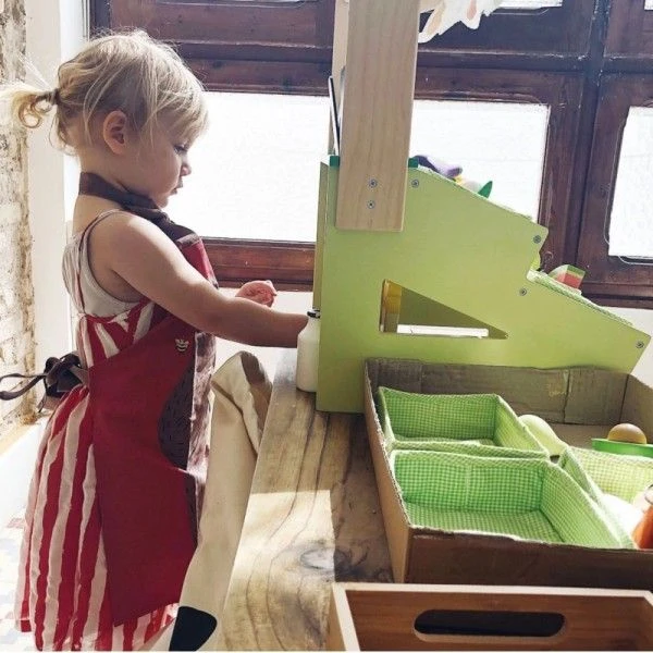 Les jouets d’imitation comme ce Jouet Dînette en bois Étal de marché Tender Leaf Toys® sont recommandés pour le développement de l’enfant et favorisent les jeux de rôles, la construction de soi et la compréhension de l’environnement social. En imitant, l’enfant interagit avec son environnement, il construit ainsi ses structures cognitives. En manipulant de nombreux petits objets, comme dans ce jeu de marchande en bois, il développe sa motricité fine. Lorsque l’enfant sert un client ou joue à compter ou à peser les aliments pour sa poupée ou ses parents, il ajuste ses gestes pour parvenir à son but. Enfin, l’imitation joue un rôle majeur dans la socialisation. Le fait de jouer d’autres rôles permet de prendre conscience de l’existence de l’autre mais aussi de soi-même et de jouer en interaction.