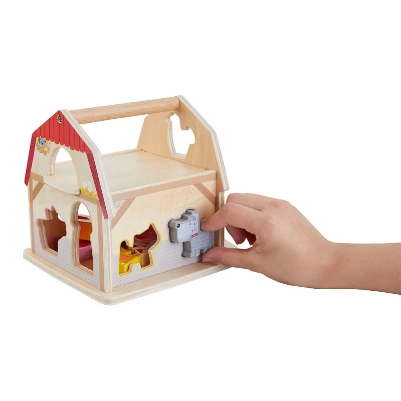 Les tout-petits vont adorer cette boîte à formes aux allures de petite ferme. A eux de trouver où se placent les animaux et la figurine de petite fille ! Une fois que tous les animaux sont dans la ferme, vous pouvez les faire sortir en ouvrant la porte, et recommencer à jouer à classer les animaux.