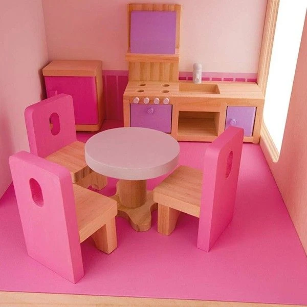 Bienvenue dans la Maison de Poupée Sevi 1831! Voici une merveilleuse maison des poupées dans laquelle, au rez-de-chaussée, vous trouverez une accueillante cuisine avec une salle à manger et un confortable salon. Vous pouvez monter au premier étage par l’escalier qui se trouve dans le salon et vous découvrirez une chambre et une salle de bain joliment décorées. La porte d’entrée et les fenêtres du rez-de-chaussée peuvent s’ouvrir pour mieux jouer. La maison est fabriquée en bois et décorée avec des peintures respectueuses de la santé, de notre environnement, et résistantes dans le respect des plus sévères normes en vigueur. La maison est meublée et deux personnages sont inclus pour mieux s’amuser et libérer la fantaisie des petits.