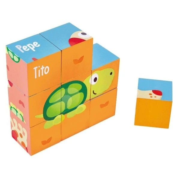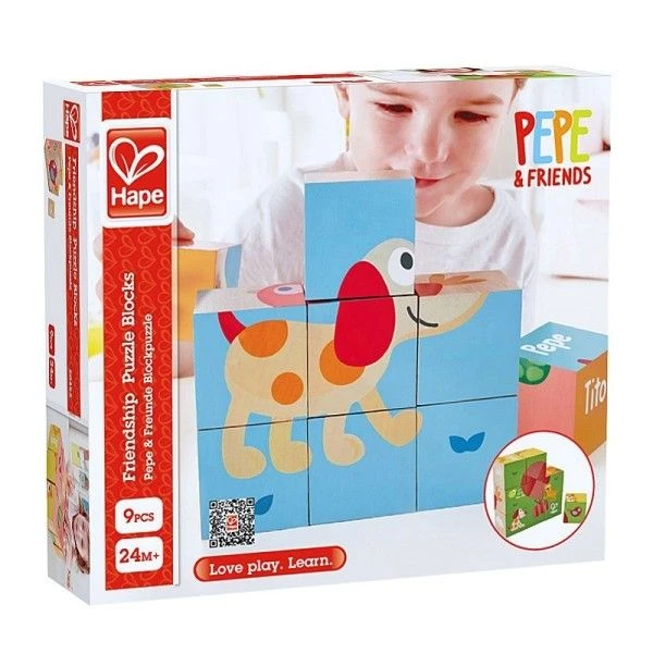Pour les petits à partir de 24 mois, éveil physique et émotionnel avec ce joli Puzzle de cubes en bois Puzzle de Cubes Puppy et ses amis Hape, … recomposer une par une les 6 scènes de ce puzzle de cubes et former ainsi Pépé (le chien), Tito (La tortue), Donte (le chaton), Lilly (l’oiseau) et 2 autres dessins regroupant tout ces amis… plus compliqués…